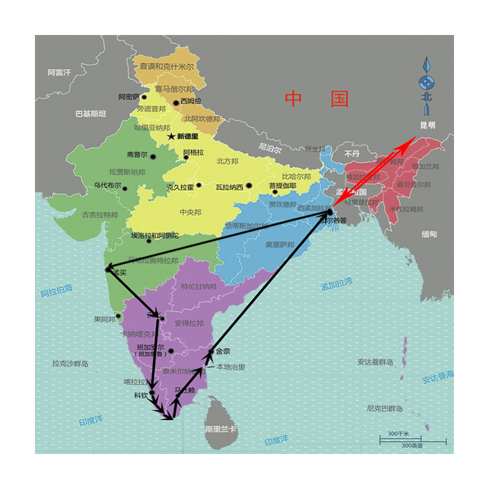 孟买、喀拉拉、亨比、科钦、阿勒皮 、科瓦兰、根尼亚古马里(科摩林角)、马杜赖、本地治理、马拉普拉姆、钦奈、加尔各答
