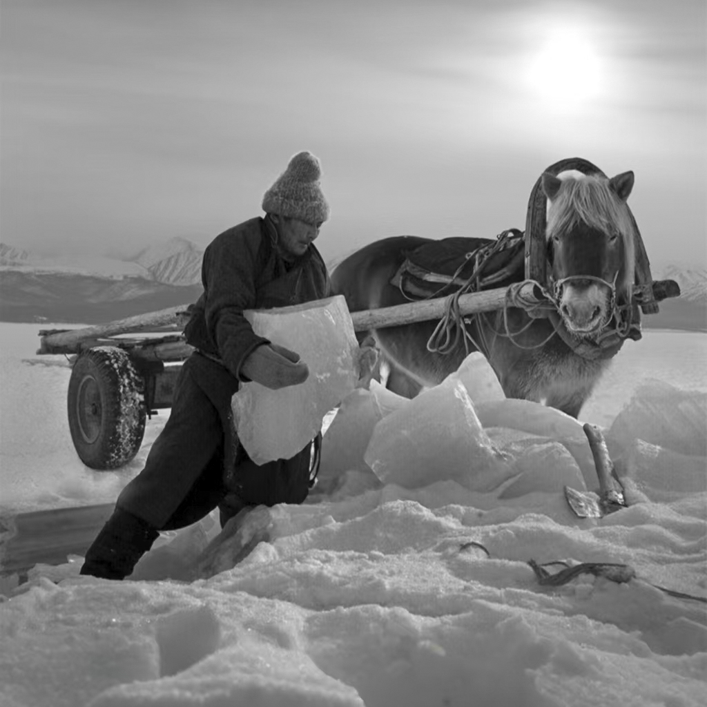 在寒冷的冬日,牧民们来到冰河上,用特制的冰凿与榔头,在厚实的冰面上开凿。他们将大块的冰用马车运回蒙古包。这些冰块将被用于储存食物、保鲜水源,成为牧民们在漫长寒冬里维持生活的重要保障。