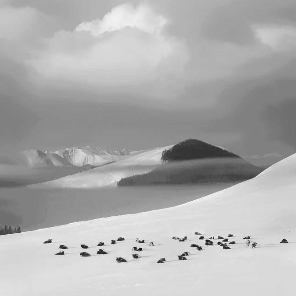 【蒙古冬韵】冰雪铸就的梦幻画卷,冷峻而迷人的童话世界。草原上,曾经随风摇曳的牧草被冰雪封印,变成了一片璀璨的水晶森林。骏马在雪地上奔腾,鬃毛飞扬,四蹄扬起的雪花如银雾般飘散,与蓝天白云相映成趣,构成了一幅充满生机与活力的冬日牧歌图。